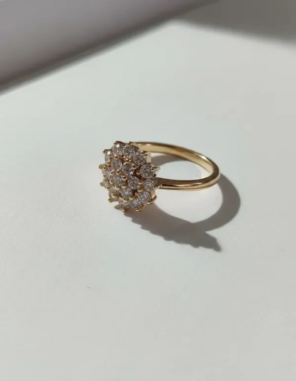 Este anillo de diseño floral en forma de bouquet reúne decenas de circonias blancas perfectamente dispuestas, creando un efecto tridimensional que deslumbra con cada movimiento. Como un ramo que nunca se marchita, esta joya simboliza plenitud, gratitud y propósito.