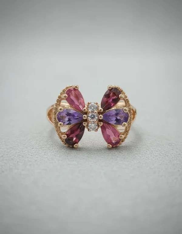 Este anillo con forma de lazo es una verdadera declaración de alegría y feminidad. Sus cristales en tonos rosados, violetas y vino tinto se combinan armoniosamente en un diseño que transmite optimismo y belleza. Perfecto para quienes no temen brillar con todos sus matices.