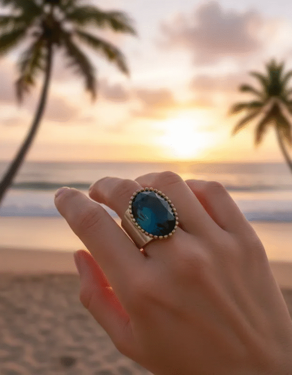 Este elegante anillo vintage, con su imponente piedra azul en forma ovalada y detalles dorados, combina fuerza y gracia en una sola joya. Su base robusta en tono plateado y los destellos sutiles alrededor de la piedra lo convierten en un accesorio de impacto, ideal para mujeres que enfrentan la vida con determinación y esperanza.