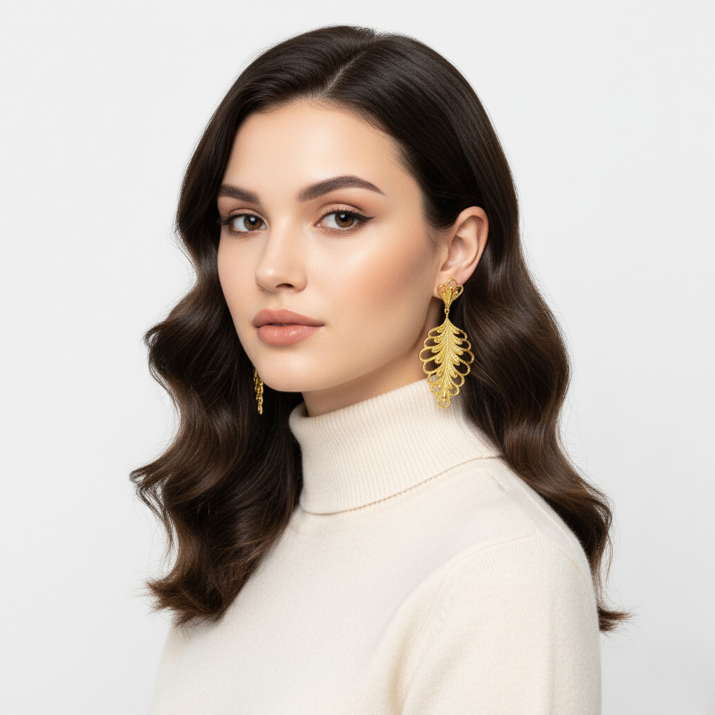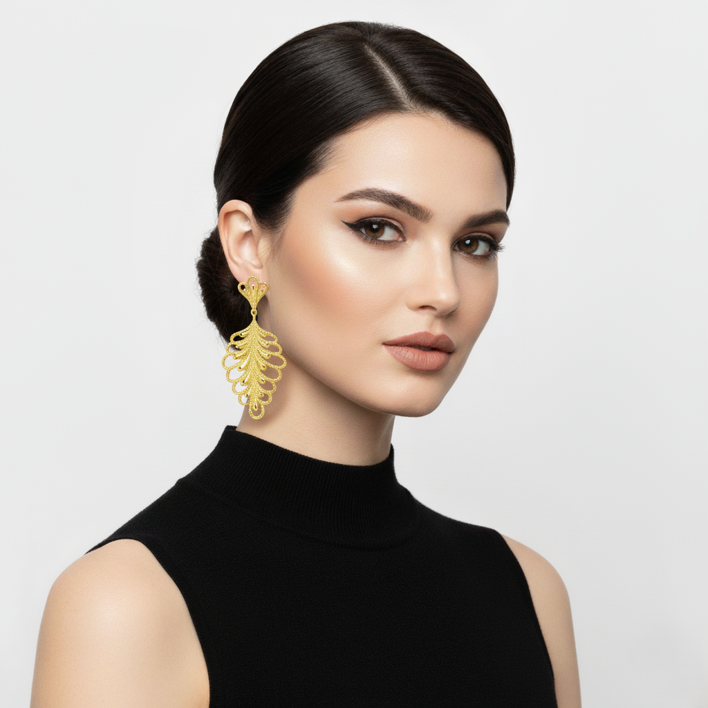 Estos majestuosos aretes dorados de diseño calado tipo pluma de pavo real están bañados en oro brillante, creados para mujeres que caminan con gracia, propósito y una belleza que trasciende. El diseño abierto y fluido representa la libertad, la protección y la delicadeza de quien confía en lo eterno.