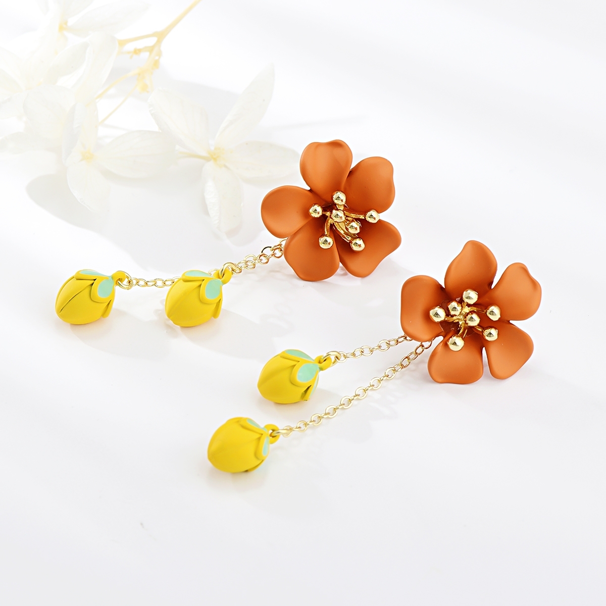 Celebra la frescura, la alegría y la feminidad con estos encantadores aretes florales de edición limitada. Su diseño único presenta una flor en tono coral con pistilos dorados y delicados frutos colgantes en tonos amarillo y verde, unidos por finas cadenas bañadas en oro.
