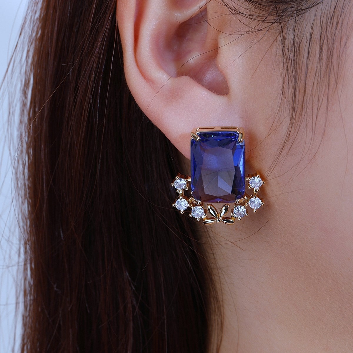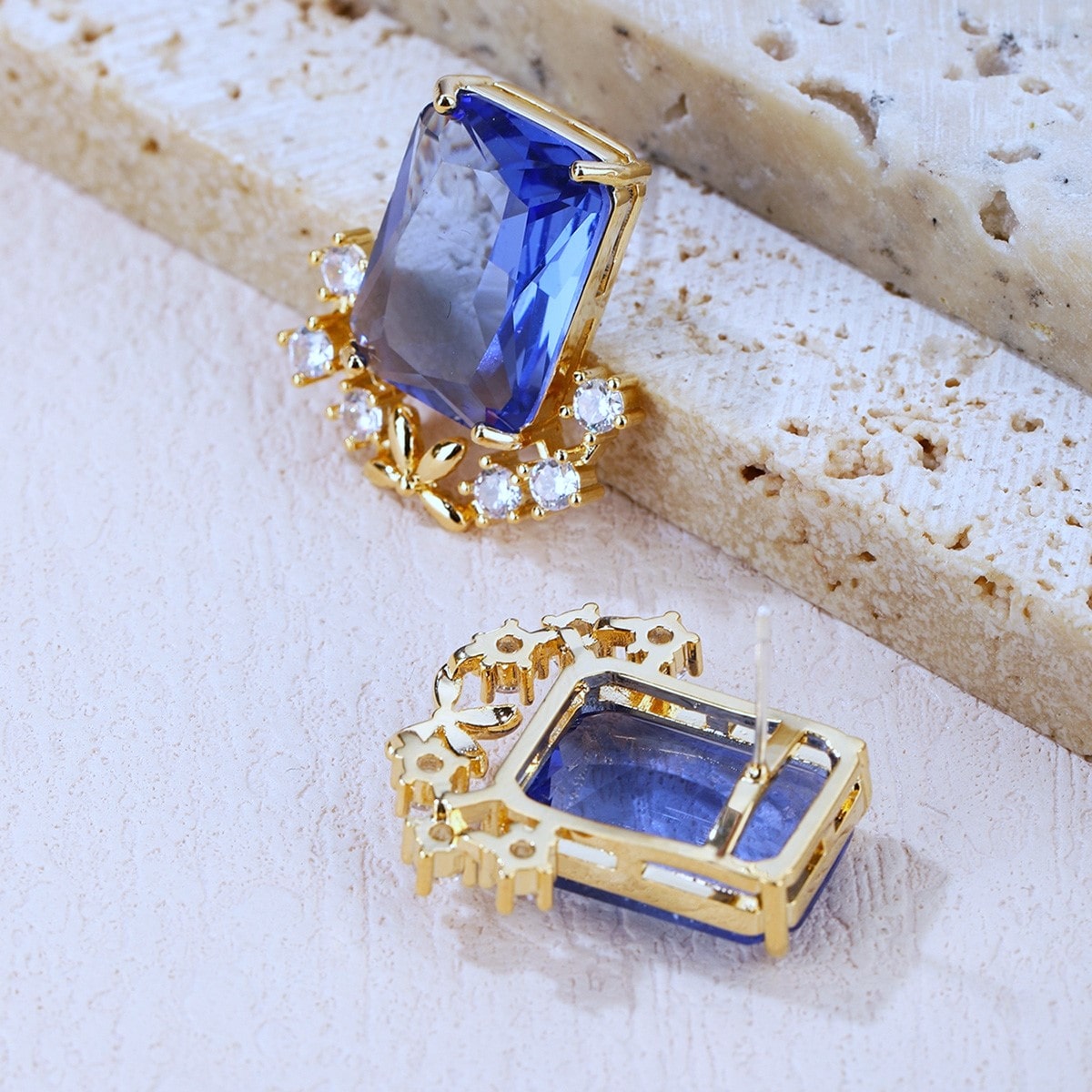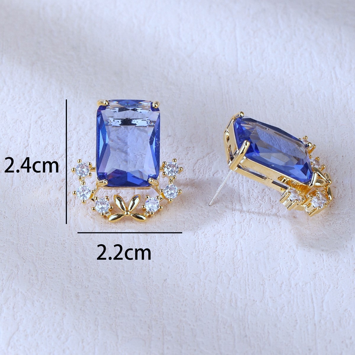 ✨ Piedra central azul (cristal corte esmeralda). Largo Aretes: 2,4 cm Ancho: 2, 2 cm. Cierre a presión.