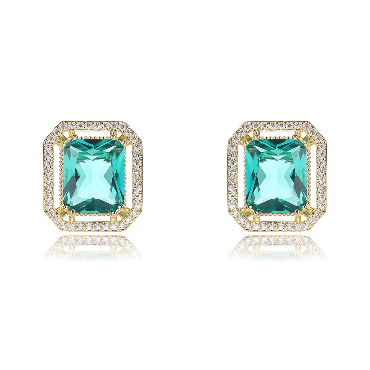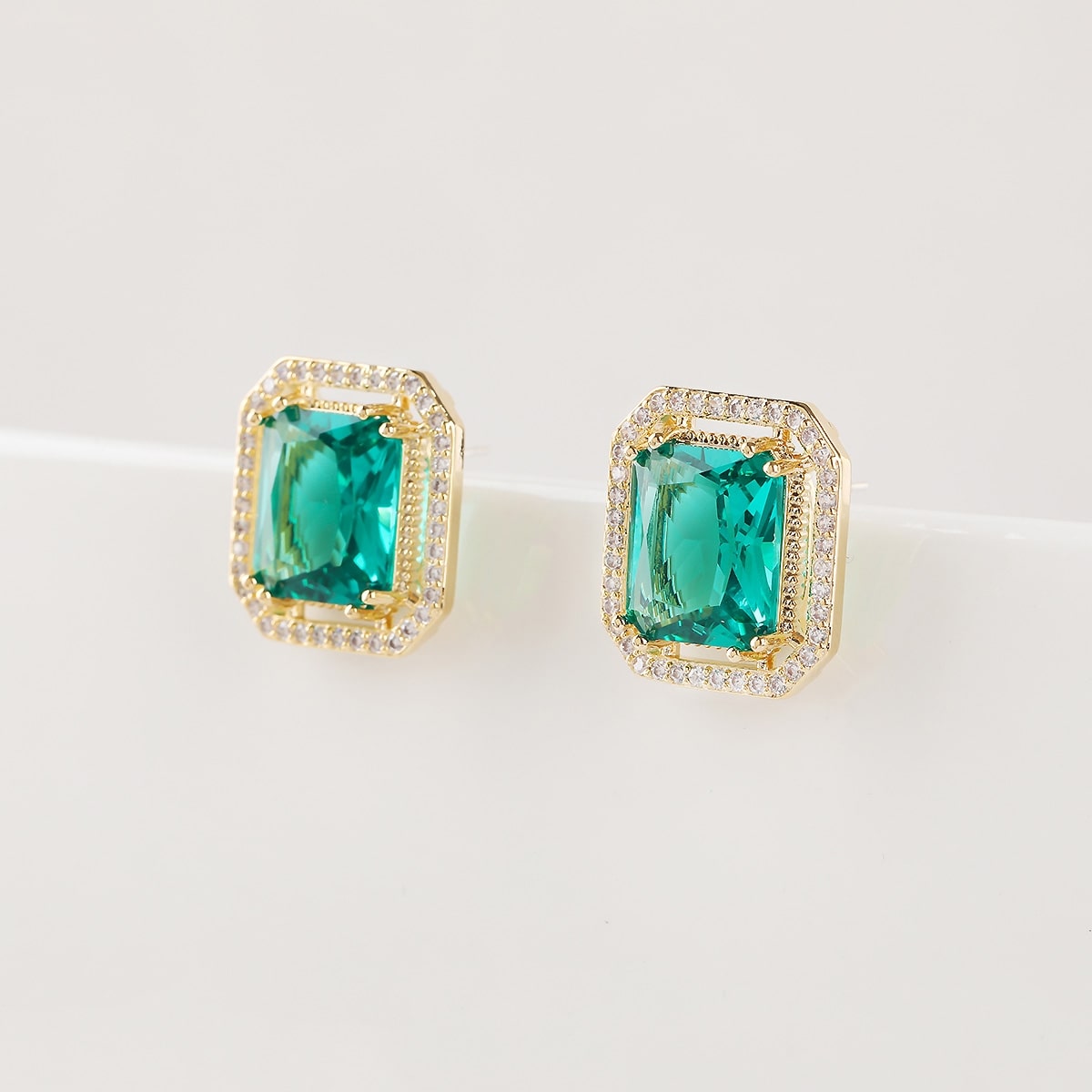 Con un diseño que evoca equilibrio y serenidad, los aretes Virtud Serena presentan una piedra central en tono verde esmeralda cuidadosamente tallada en forma rectangular, rodeada por un halo de cristales brillantes que resaltan su resplandor natural.