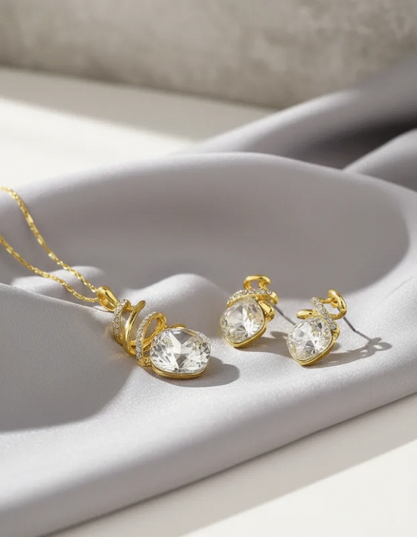 El set incluye un collar y un par de aretes elaborados en aleación fina con baño de oro brillante, decorados con un cristal blanco tipo diamante de corte brillante. El diseño en espiral con incrustaciones de micro circones aporta sofisticación y movimiento, elevando cualquier look con un toque de luz sutil.